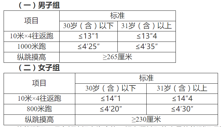 體能測(cè)評(píng)三項(xiàng)全部達(dá)標(biāo)方為合格。報(bào)考緊缺職位人員體能測(cè)評(píng)項(xiàng)目三項(xiàng)中有兩項(xiàng)達(dá)標(biāo)的,視為合格。體能測(cè)評(píng)項(xiàng)目中,縱跳摸高項(xiàng)目的測(cè)評(píng)次數(shù)不超過3次,10米×4往返跑項(xiàng)目的測(cè)評(píng)次數(shù)不超過2次,男子1000米跑、女子800米跑項(xiàng)目的測(cè)評(píng)次數(shù)為1次。
