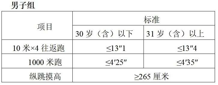 參照《關于印發(fā)公安機關錄用人民警察體能測評項目和標準(暫行)的通知》(人社部發(fā)〔2011〕48號)的項目及測試規(guī)則,結合《公安民警體育鍛煉達標手冊》成績標準,體能測評的項目和標準如下: