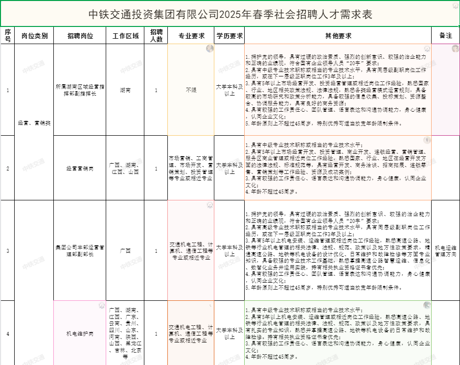 附件1:中鐵交通投資集團有限公司2025年春季社會招聘人才需求表