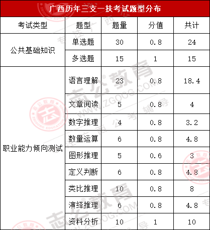 上篇我們寫到,三支一扶的待遇,在廣西這個(gè)待遇還算不錯,政策上的支持也非常好,那么預(yù)計(jì)這個(gè)月月底出公告的三支一扶,啥時(shí)候筆試呢?2024年廣西三支一扶筆試時(shí)間是7月13日,其筆試科目為《綜合知識》一科,滿分100分。基于往年考生的回憶,綜合知識內(nèi)容主要包括公共基礎(chǔ)知識和行測職業(yè)能力測試兩個(gè)科目,而各題型的題量及分值如下圖所示: