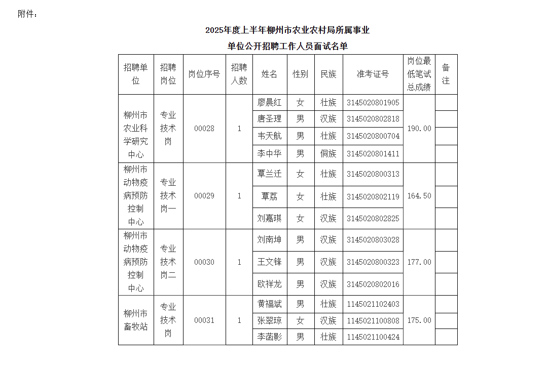 附件:2025年度上半年柳州市農(nóng)業(yè)農(nóng)村局所屬事業(yè)單位公開(kāi)招聘工作人員面試名單