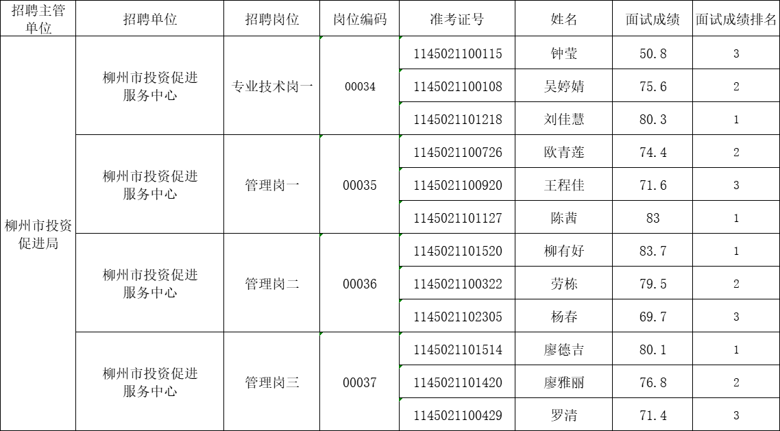 2025年柳州市投資促進(jìn)局所屬事業(yè)單位公開招聘工作人員面試成績公示