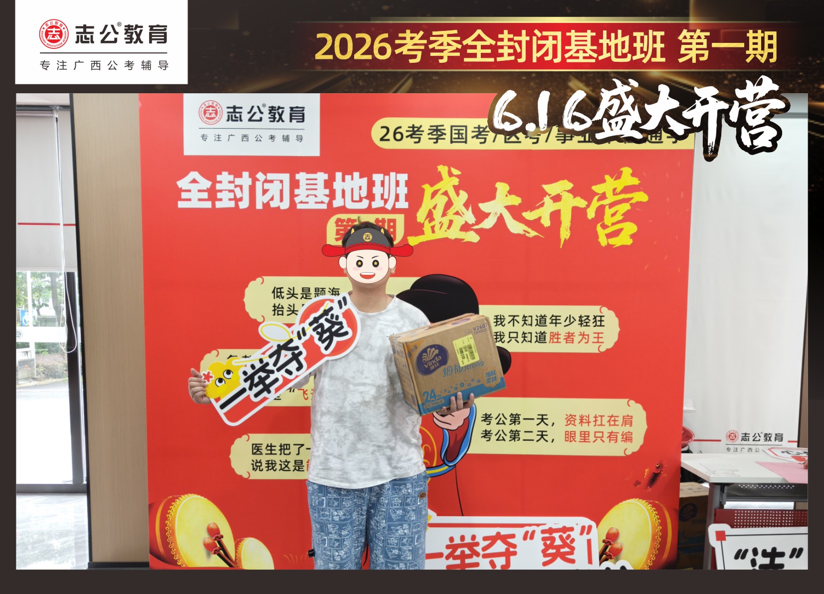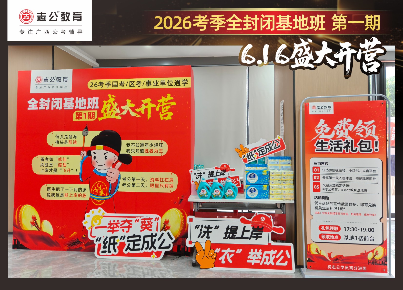 今天的開班還有一系列小活動(dòng)噢~瞧!——“學(xué)員打卡活動(dòng)”,所有今天到場(chǎng)的基地班學(xué)員,通過(guò)做一些小任務(wù)的方式,可以到前臺(tái)領(lǐng)取生活禮包即可領(lǐng)取生活禮品1份(一提六包的紙巾,或者一瓶洗衣液),這也是志公教育對(duì)所有學(xué)員的美好祝愿,預(yù)祝大家未來(lái)能夠“紙”定成公,“洗”提上/岸,“衣舉成公”!
