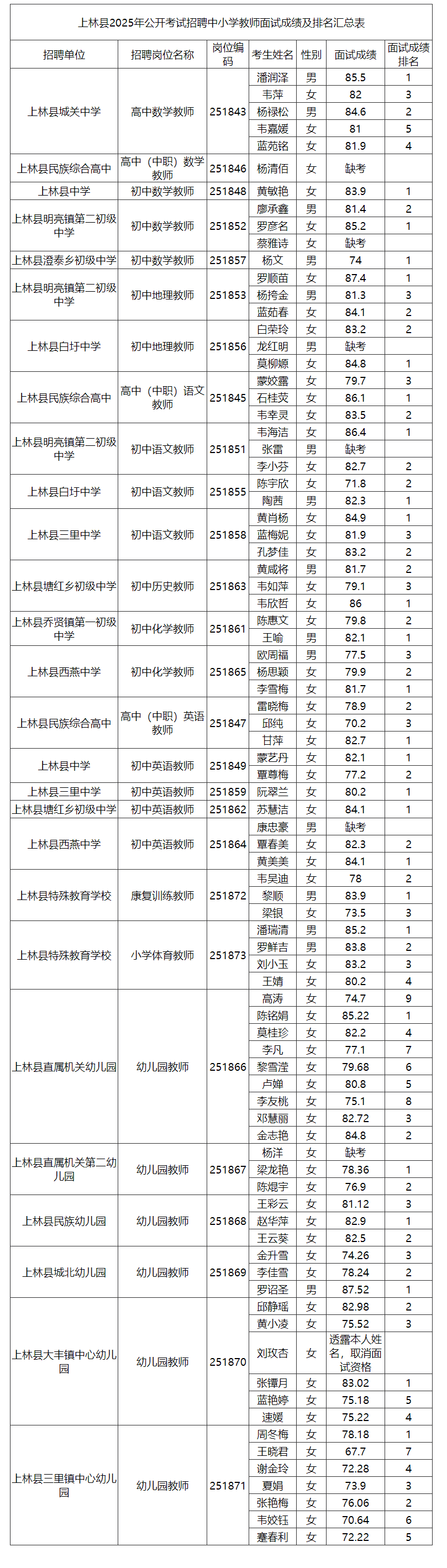 上林縣2025年公開考試招聘中小學(xué)教師面試成績(jī)及排名公告