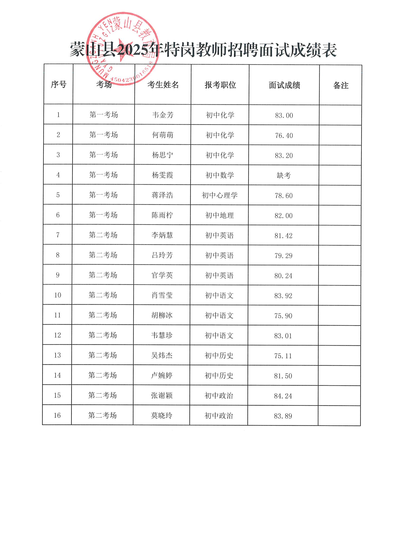 原文標題:蒙山縣2025年特崗教師招聘面試成績公告
