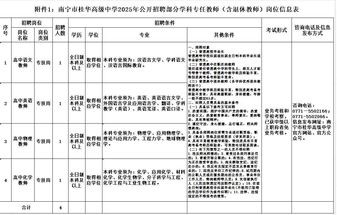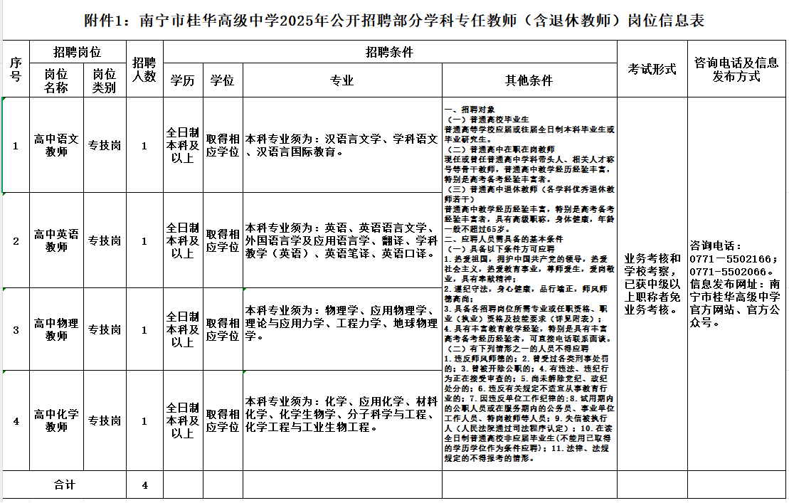 附件1:《南寧市桂華高級(jí)中學(xué)公開(kāi)招聘專(zhuān)任教師(含退休教師)崗位信息表》