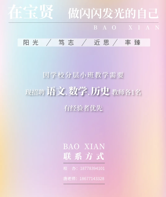 4.取得初級中學以上教師資格證,具有良好的身體和心理素質(zhì),體檢符合教師資格認定標準,對教育有理想追求,理解并愿意踐行桂林市疊彩區(qū)寶賢學校辦學理念。