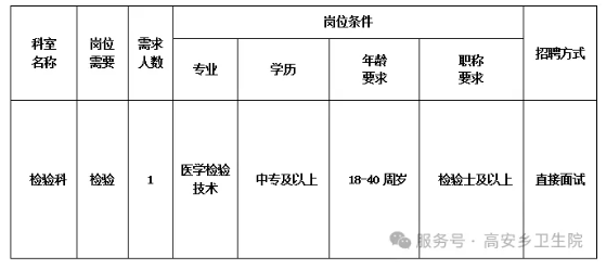 來賓市興賓區(qū)高安鄉(xiāng)衛(wèi)生院是一家集醫(yī)療、預(yù)防保健、康復(fù)醫(yī)療于一體的國家公立基層醫(yī)療機構(gòu),現(xiàn)有職工45人,服務(wù)人口約2萬人。因工作需要,我院擬向社會公開招聘編制限額外檢驗科人員1名,現(xiàn)將有關(guān)招聘事項公告如下: