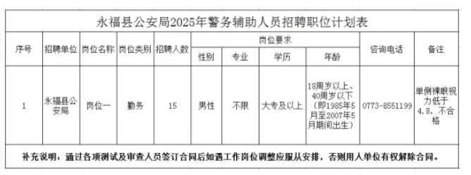計(jì)劃招聘警務(wù)輔助人員15名。具體崗位、招聘人數(shù)、資格條件詳見(jiàn)《永??h公安局輔警招聘計(jì)劃表》。