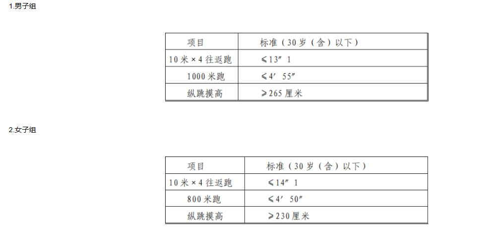 體能測評項目中,縱跳摸高的測試次數不超過3次,10米×4往返跑測評次數為2次,1000米/800米的測評次數均為1次。應聘勤務崗位的人員,體能測評三項全部達標的方為合格;應聘文職崗位的人員,體能測評三項有兩項達標的,視為合格。