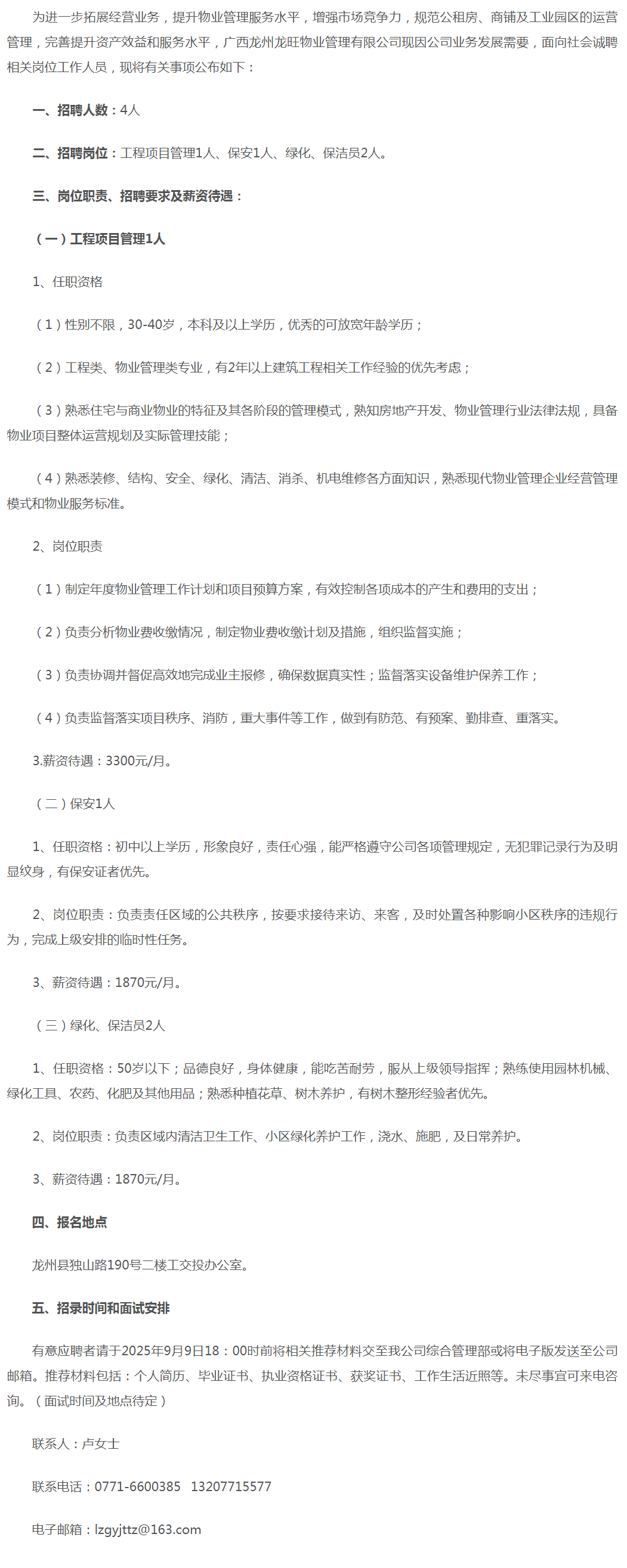 2025年廣西龍州龍旺物業(yè)管理有限公司招聘公告