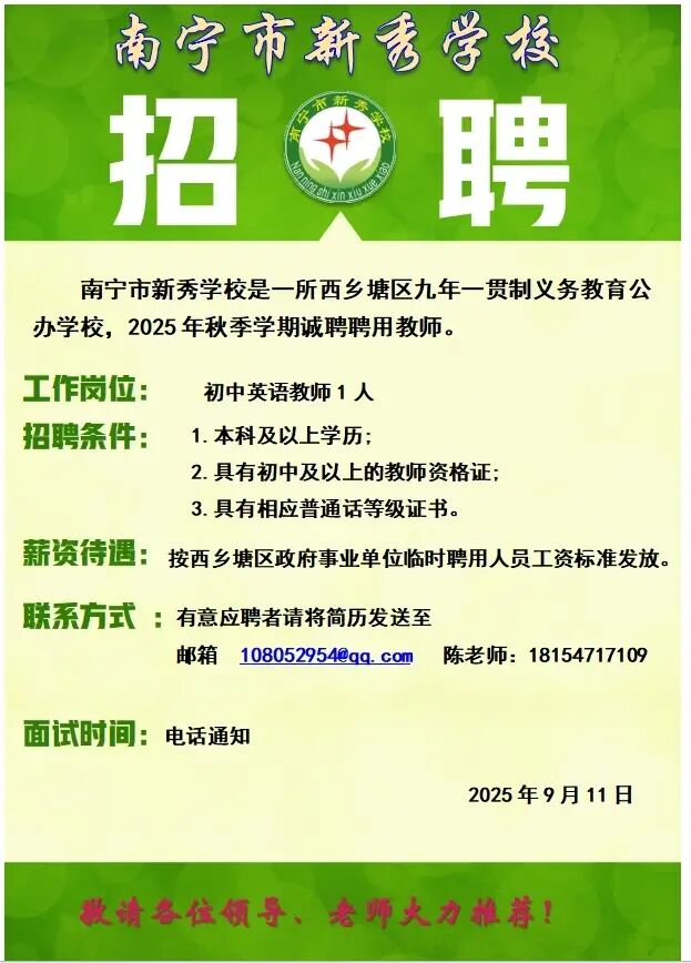 原文標(biāo)題:2025年南寧新秀學(xué)校招教師1人