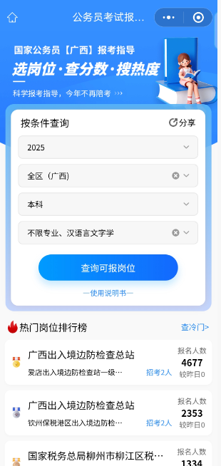 在這里,你能清晰查看各個崗位的系統(tǒng)熱度,官方報(bào)考人數(shù)、崗位報(bào)名條件,入面分?jǐn)?shù)和錄取分?jǐn)?shù),這些數(shù)據(jù)都是經(jīng)過精準(zhǔn)整理與分析的,能為你的選崗提供有力參考。
