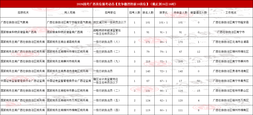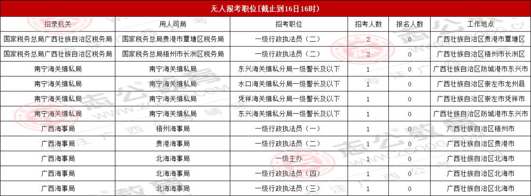 考生們注意!截至10月16日16時(shí),2026國(guó)考(廣西)地區(qū)還有71個(gè)無(wú)人報(bào)考,占全部748個(gè)職位的9.49%。想避開(kāi)激烈競(jìng)爭(zhēng)的話,不妨結(jié)合自己的條件,多看看這些冷門崗位~