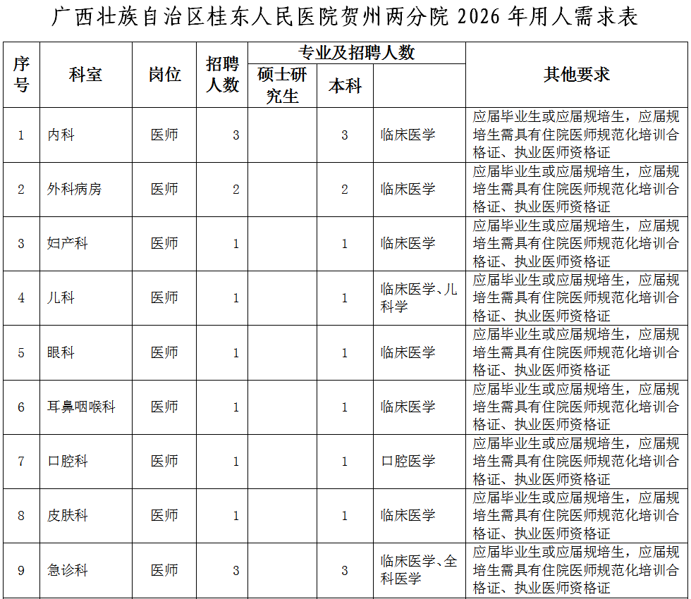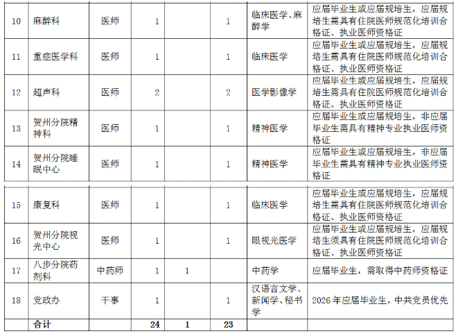 (應(yīng)聘報(bào)名二維碼)同時(shí),按以下要求提供個(gè)人應(yīng)聘材料(電子版)發(fā)電子郵箱:gdyy2817726@163.com(郵件主題請(qǐng)標(biāo)明:“姓名+賀州兩分院”字樣)。應(yīng)屆畢業(yè)生:個(gè)人簡(jiǎn)歷、身份證、就業(yè)推薦表、成績(jī)單、各種獎(jiǎng)項(xiàng)獎(jiǎng)勵(lì)證書(shū)、外語(yǔ)等級(jí)證書(shū)等。非應(yīng)屆畢業(yè)生:個(gè)人簡(jiǎn)歷、身份證、畢業(yè)證、畢業(yè)證備案登記表、學(xué)位證、學(xué)位證備案登記表、職稱證、執(zhí)業(yè)證、住院醫(yī)師規(guī)范化培訓(xùn)合格證、工作證明等。報(bào)名時(shí)所提交的申請(qǐng)材料必須真實(shí)、準(zhǔn)確,因報(bào)名時(shí)提交的申請(qǐng)材料不真實(shí)、不完整或錯(cuò)誤填寫(xiě)報(bào)名信息,造成資格審查、面試資格審查不通過(guò)的,后果由報(bào)名人員自行承擔(dān)。(2)資格審核。人事科依據(jù)招聘公告和用人需求規(guī)定的資格條件對(duì)應(yīng)聘人員簡(jiǎn)歷進(jìn)行收集和資格初步審查,經(jīng)招聘工作領(lǐng)導(dǎo)小組審核后,確定符合崗位條件報(bào)名人員名單,由醫(yī)院人事科電話或短信通知符合條件人員。(3)考核??己斯P試和面試由人事科負(fù)責(zé)組織實(shí)施,協(xié)助部門(mén)為醫(yī)務(wù)部、護(hù)理部、科教科以及用人科室,紀(jì)律監(jiān)督部門(mén)為監(jiān)察室。逾期未參加則視為自愿放棄。(4)試工。通過(guò)考核的非應(yīng)屆畢業(yè)應(yīng)聘人員,須到醫(yī)院試工5天。試工不通過(guò),不予聘用。(5)體檢。體檢工作由廣西壯族自治區(qū)桂東人民醫(yī)院按照有關(guān)規(guī)定統(tǒng)一組織。體檢標(biāo)準(zhǔn)參照《廣西壯族自治區(qū)事業(yè)單位公開(kāi)招聘人員體檢通用標(biāo)準(zhǔn)(試行)》《廣西壯族自治區(qū)事業(yè)單位公開(kāi)招聘人員體檢操作手冊(cè)(試行)》執(zhí)行。體檢不合格或隱瞞真實(shí)情況致使體檢結(jié)果失真的,不予聘用。因體檢不合格空缺崗位的,將按考核的綜合成績(jī),從高到低,順位補(bǔ)充體檢人員。(6)公示和聘用。對(duì)擬聘非應(yīng)屆畢業(yè)應(yīng)聘者在全院范圍內(nèi)進(jìn)行公示,公示期為5個(gè)工作日,公示期滿無(wú)異議按程序辦理聘用手續(xù)。對(duì)公示有異議,經(jīng)核實(shí)影響聘用的,取消其聘用資格;對(duì)反映問(wèn)題難以核實(shí)的暫緩聘用,待核實(shí)清楚后按有關(guān)規(guī)定辦理。