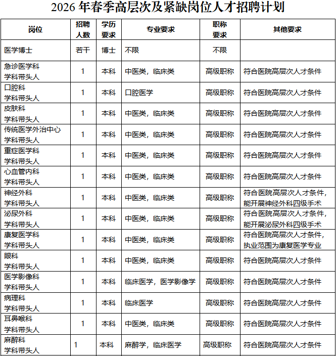 本著按需招聘,貫徹“公開、平等、競爭、擇優(yōu)”原則,現(xiàn)將2026年春季高層次及緊缺崗位人才招聘有關事項公告如下: