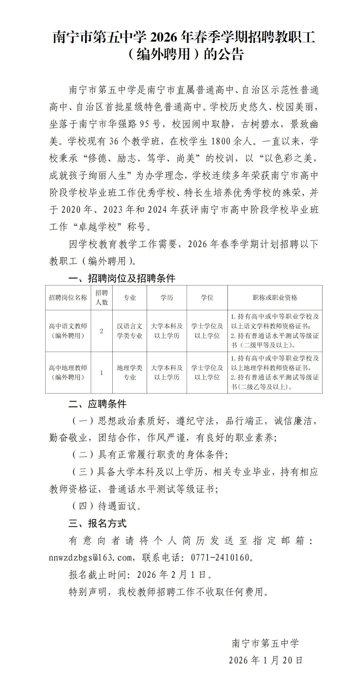 2026年春季學(xué)期南寧市第五中學(xué)招聘教職工3人