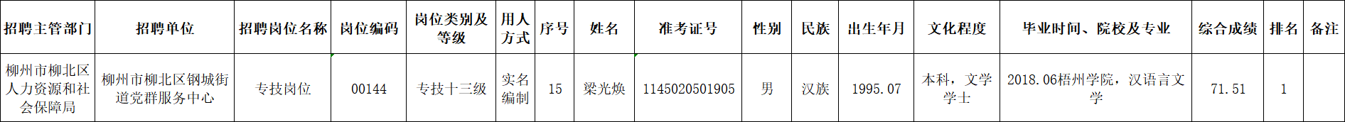 根據(jù)《柳州市2025年度下半年事業(yè)單位公開考試招聘工作人員公告》要求及安排,梁光煥同志經(jīng)面試、考察、體檢合格,符合聘用條件。經(jīng)研究決定,擬聘用梁光煥同志為我區(qū)事業(yè)單位工作人員,現(xiàn)予以公示,公示期為5個工作日(2026年1月22日至2026年1月28日)。對擬聘用的同志如有異議,請以書面形式,并署真實(shí)姓名和聯(lián)系地址,于2026年1月28日前郵寄或直接送我單位(地址:柳州市勝利路12-8號柳北區(qū)政府4樓417室;郵編:545002,電話0772-2513360),群眾如實(shí)反映有關(guān)問題受法律保護(hù)。