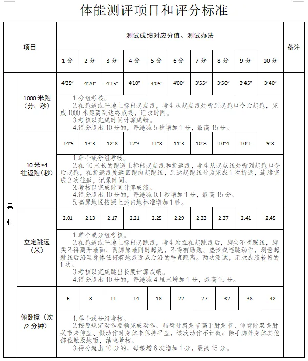 1.體能測評(60%):體能測試內(nèi)容為四個項目,1000米跑(分、秒)、俯臥撐(次/2分鐘)、10米*4往返跑(秒)、立定跳遠(yuǎn)(米)。報考人員須自帶運動服、運動鞋完成體能測試。