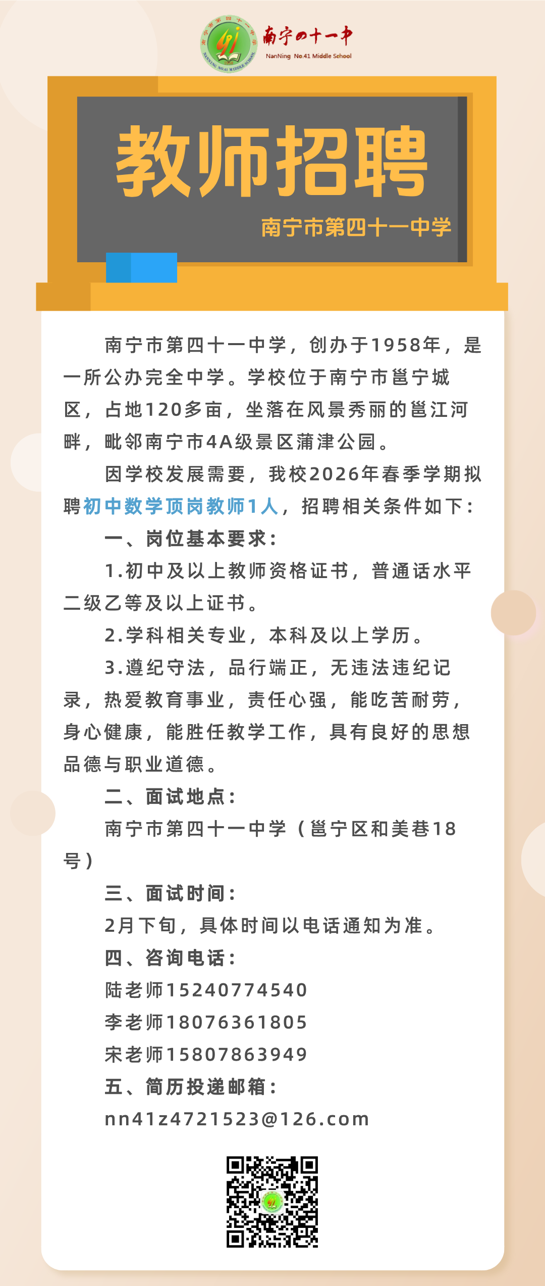 2026年春季學(xué)期南寧市第四十一中學(xué)關(guān)于公開招聘頂崗教師的啟事