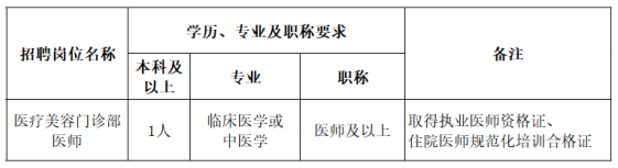 根據(jù)醫(yī)院發(fā)展需要,現(xiàn)面向社會招聘醫(yī)療美容門診部醫(yī)師,有關招聘事項公告如下: