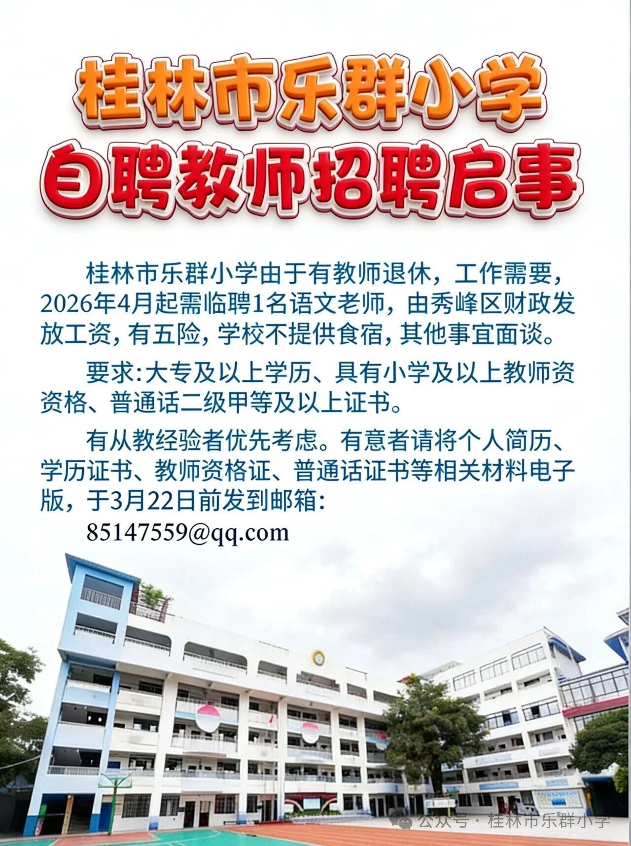 原文標題:桂林市樂群小學自聘教師招聘啟事
